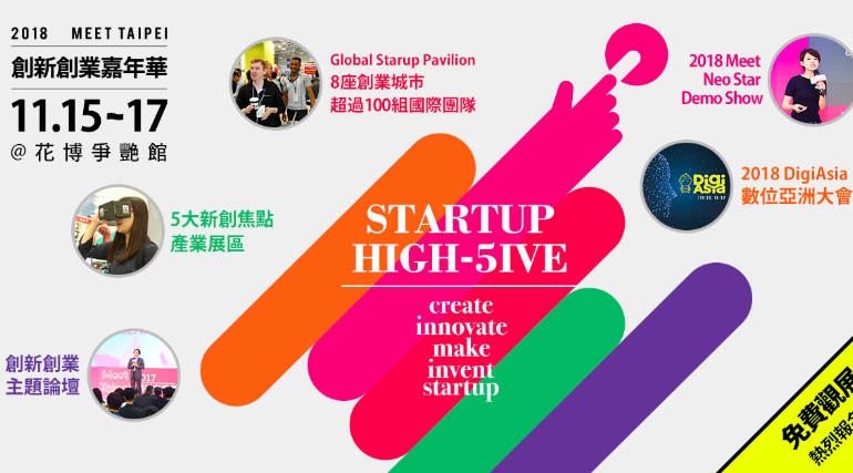 2018年的MEET Taipei創新創業展於今日(15日)上午開展,今年展會以 Startup High-5ive為主題。榮譽社長何飛鵬作為開展引言人、副市長林欽榮先生、國發會副主委曾旭正親臨現場致詞。最近風靡的凱比同學機器人引爆開場。今年大會共有超過450組的展出企業與新創。分別來自21國27座國際城市,重量講者及評審參與,三整天的活動預計吸引超過 70,000人觀展。