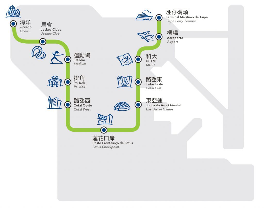 澳門輕軌氹仔線全長9.3公里,共設11個車站,將採用全自動駕駛的膠輪列車系統。服務範圍覆蓋氹仔巿中心的主要住宅區、舊城區及旅遊區,覆蓋範圍廣泛。當中受旅客歡迎的威尼斯人酒店、銀河酒店、新濠影匯和官也街亦相當接近輕軌車站,串連澳門的海、陸、空三個重要口岸。為擴大輕軌系統的整體效益,特區政府亦已先後展開氹仔線連接媽閣以及石排灣線的建設,以及輕軌東線的研究工作。