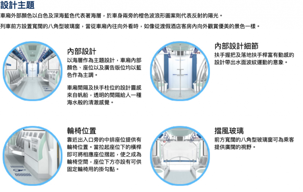 「濱海巡航」車身以藍色為主調,營造澳門富有海濱度假特色的一面。輕軌採用全自動無人駕駛,列車以2或4節一組運作,每節車廂長約11.8米、濶2.8米、高3.8米,可容納約100人。而每站更有不同特式的設計,在路氹生態保護區周邊的濕地為候鳥居住的地方,在緣沿路一帶安裝“視覺屏障”,避開候鳥的目光,以減低對候鳥的影響。