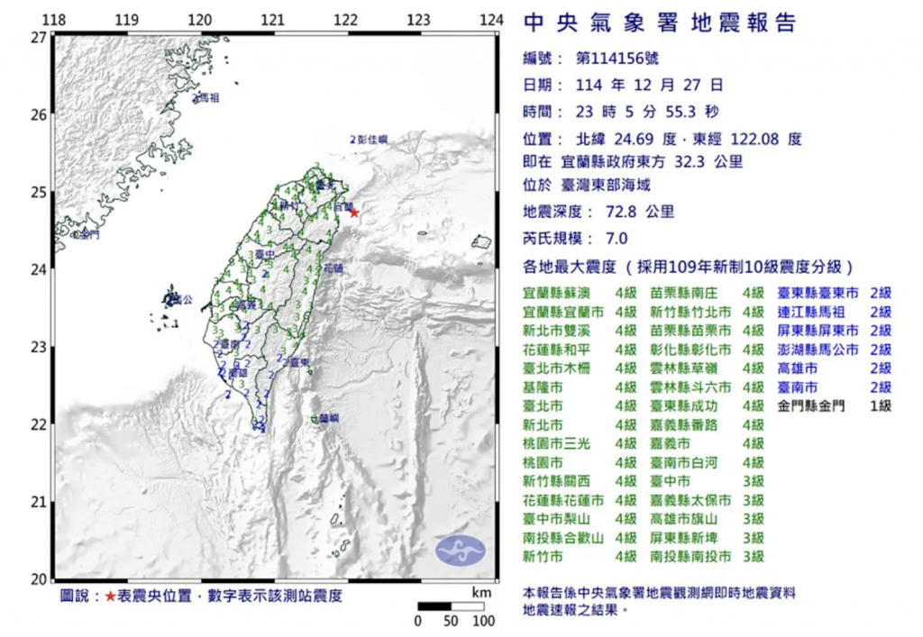 今(27)日23時05分,台灣東部海域發生規模7.0地震,地震深度72.8公里,震央位於宜蘭縣政府東方32.3公里。各地最大震度(縣市):宜蘭縣、新北市、花蓮縣、台北市、基隆市、桃園市、新竹縣、台中市、南投縣、新竹市、苗栗縣、彰化縣、雲林縣、台東縣、嘉義縣、嘉義市、台南市4級。 (圖/翻攝自氣象署網頁) 相關文章 真觀點/電動車該買嗎1 買電動車有什麼好處?看完你就知道該不該買了 2025-12-28 【氣象週報】跨年夜急凍!冷氣團週三攜雨報到 全台低溫恐探 12 度 2025-12-28 志玲姊姊變身「限定版」啦啦隊!羞喊「裝可愛怎麼好意思」 仙氣鎮壓全場 2025-12-28 迴響 Cancel Reply抱歉,你必須要登入才能發表迴響喔!