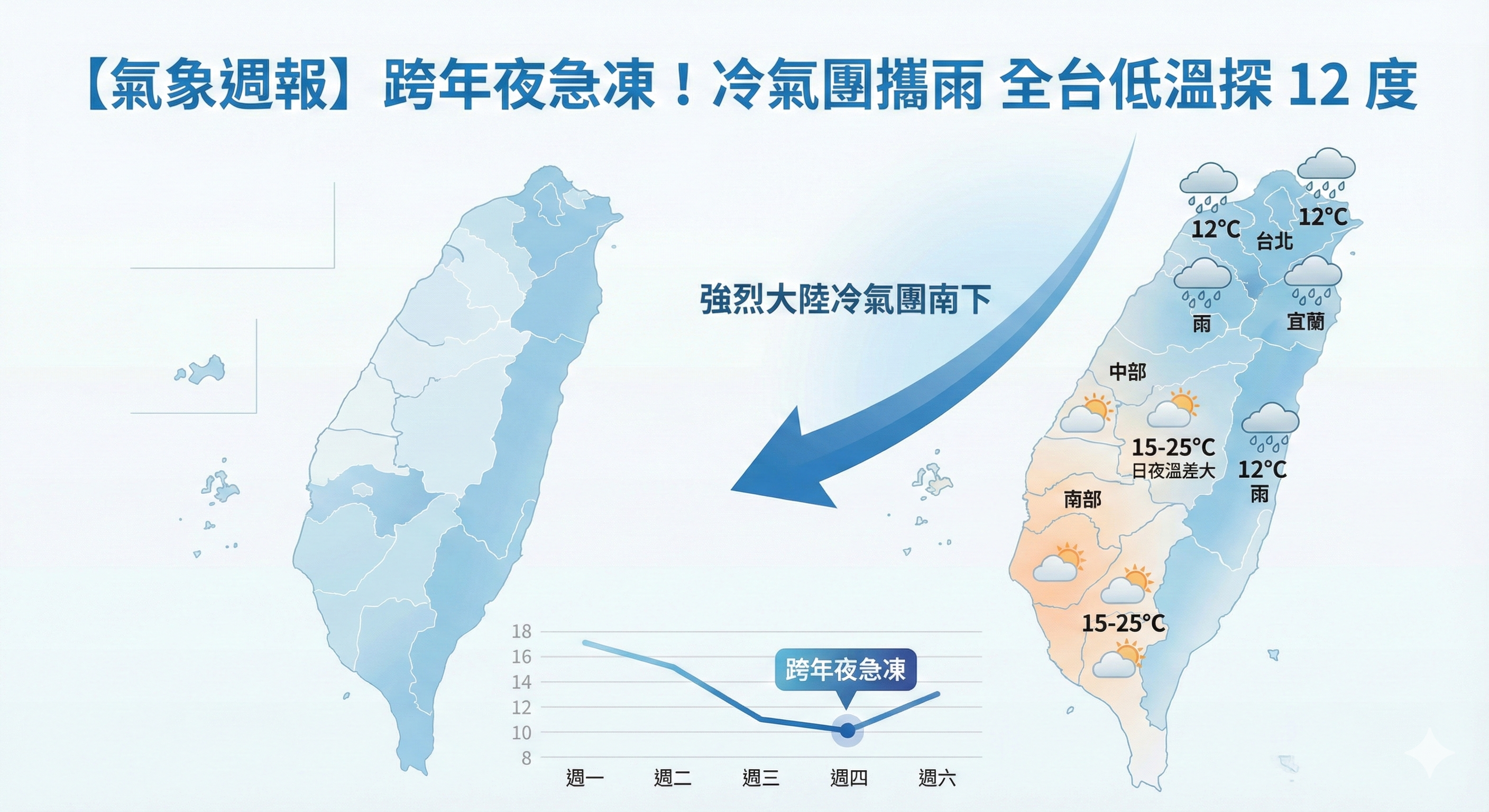 揮別 2025 年,迎接 2026 年的最後一週,全台民眾請注意保暖!中央氣象署表示,本週天氣猶如「溜滑梯」,週一、週二受東北季風影響,北部與東半部維持濕涼;關鍵轉折點將出現在週三(31日)跨年夜,屆時強烈大陸冷氣團南下,全台氣溫顯著下降,元旦當天最冷,北部低溫恐下探 12 度,民眾外出參與跨年活動務必備妥禦寒衣物。