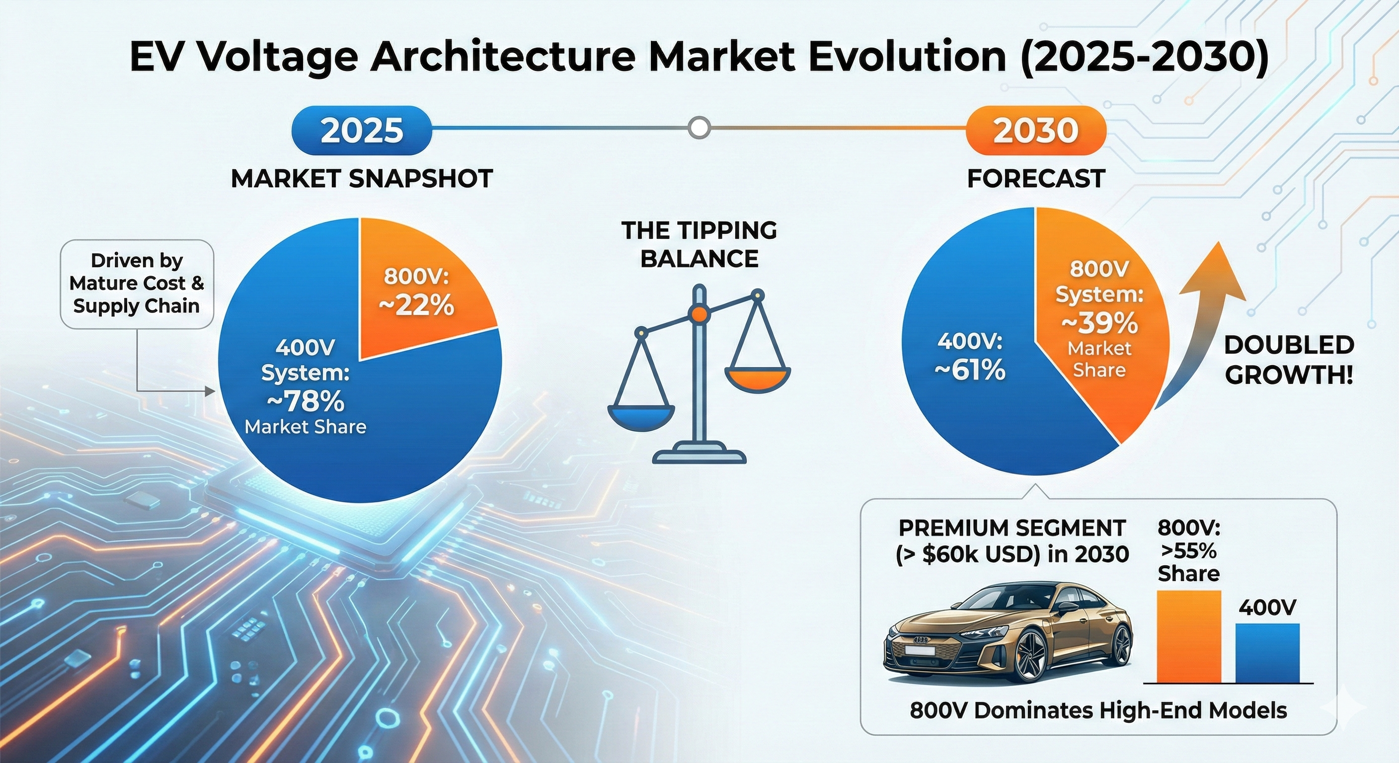 儘管 800V 架構優勢明顯,但在 2025 年,400V 系統仍佔據約 78% 的市場份額,主要原因在於成本與供應鏈的成熟度。然而,這是一個正在快速傾斜的天平。預測顯示,到 2030 年,800V 平台的市佔率將翻倍成長至 39%,甚至在售價 6 萬美元以上的高端車型中,佔比將超過 55% 。